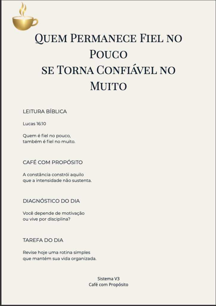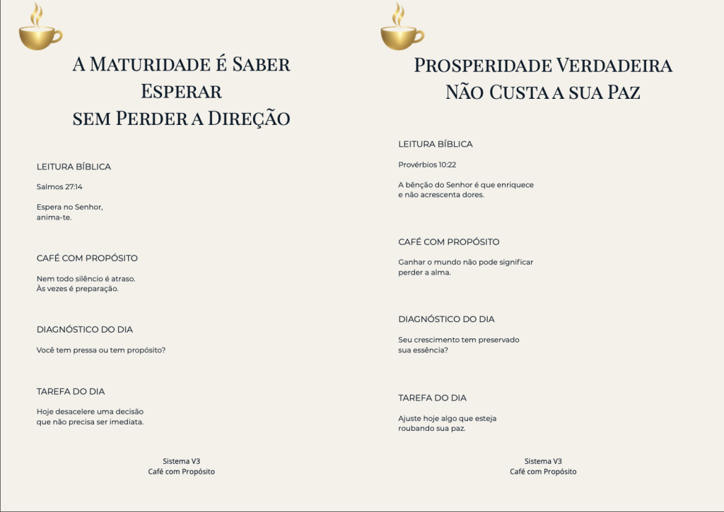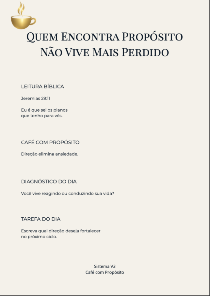 O Café com Propósito é um devocional digital prático e profundo, criado para ajudar você a começar o dia com clareza, direção, paz e propósito. É um material para fortalecer seu interior antes que a pressão do dia assuma o controle.